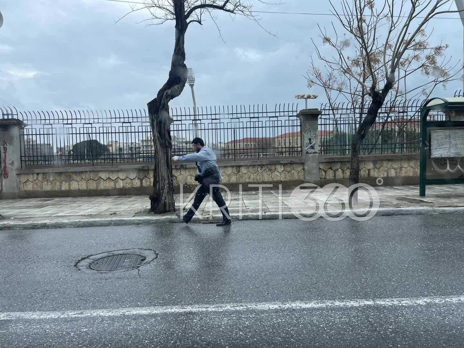 Περαστικοί τον είδαν με σταθερό βήμα και αποφασιστικότητα να περπατά την οδό Παπανδρέου χωρίς να ενοχλείται από τις ψιχάλες της βροχής.
