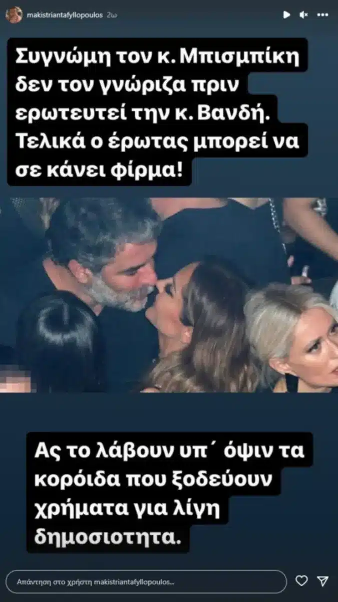 «Συγνώμη τον κ. Μπισμπίκη δεν τον γνώριζα πριν ερωτευτεί την κ. Βανδή. Τελικά ο έρωτας μπορεί να σε κάνει φίρμα! Ας το λάβουν υπόψιν τα κορόιδα που ξοδεύουν χρήματα για λίγη δημοσιότητα.»