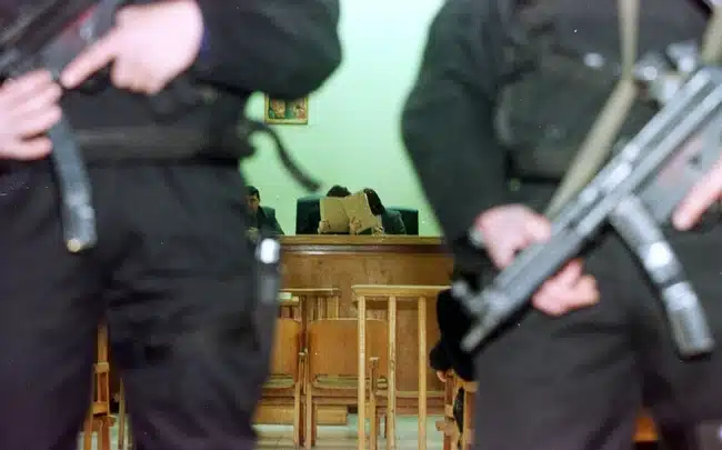 Σημαδεύοντας τον μάρτυρα υπεράσπισης, ζητάει από τον αστυφύλακα Κωνσταντίνο Κουτουλάκη να αφήσει το υπηρεσιακό του όπλο στο εδώλιο του κατηγορουμένου. «Πείτε την αλήθεια. Θα σας σκοτώσω όλους…», φώναζε σε κατάσταση αμόκ.