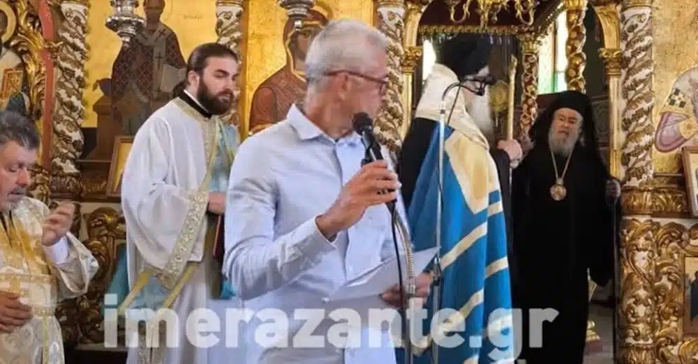 Όλα έγιναν κατά τη δοξολογία της 28ης Οκτωβρίου μέσα στον Ιερό Μητροπολιτικό Ναό Αγίου Νικολάου στη Ζάκυνθο, όταν τον λόγο πήρε ο διευθυντής του 1ου Δημοτικού σχολείου του νησιού, Ηλίας Φλάμπουρας.