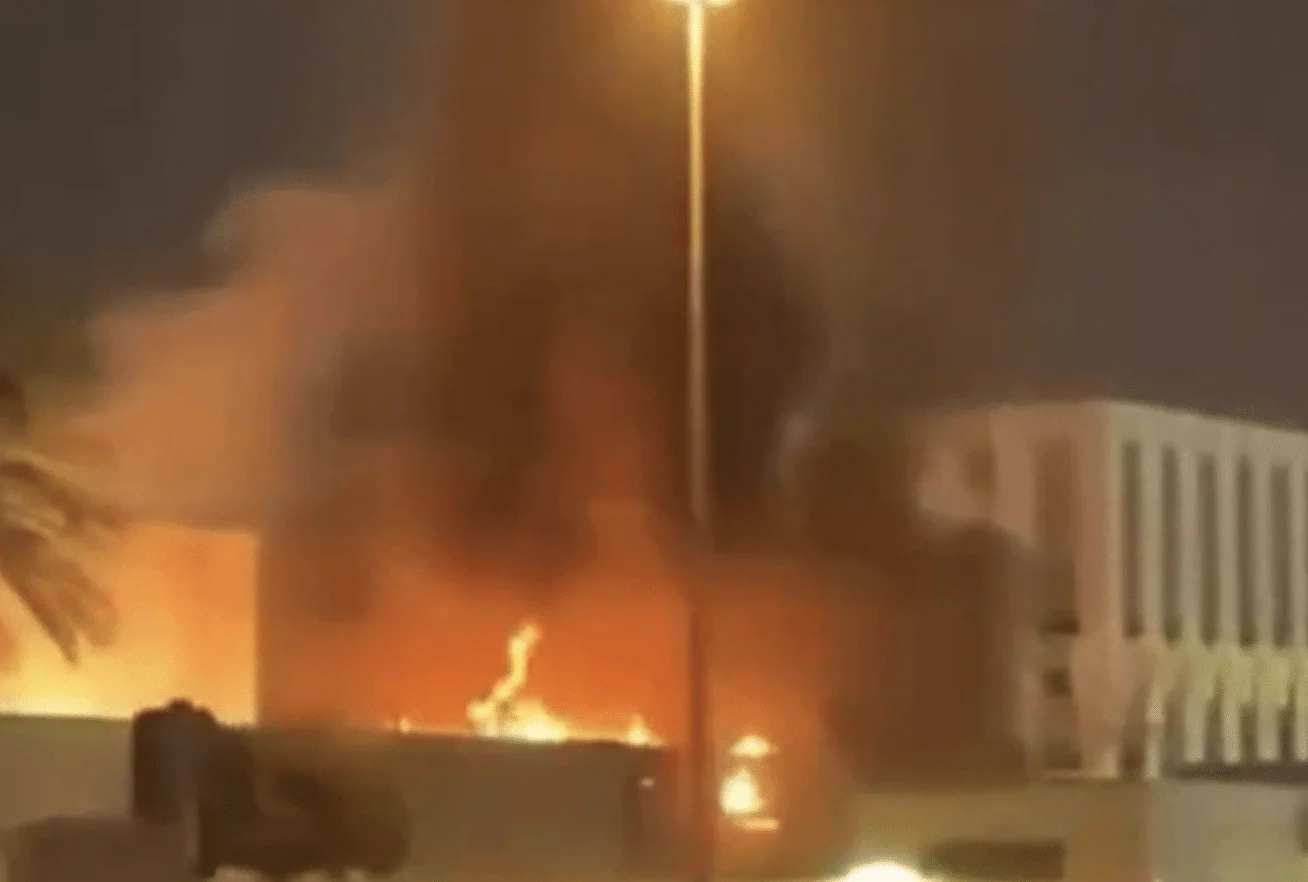 Πυκνός καπνός κάλυψε τον ουρανό στην περιοχή που βρίσκεται το αμερικανικό προξενείο στο Ντουμπάι, με τις φλόγες να υψώνονται, δημιουργώντας σκηνικό καταστροφής.