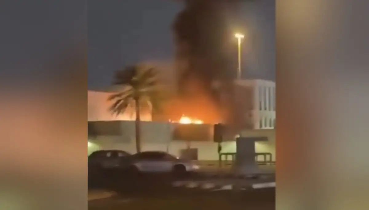 Πυκνός καπνός κάλυψε τον ουρανό στην περιοχή που βρίσκεται το αμερικανικό προξενείο στο Ντουμπάι, με τις φλόγες να υψώνονται, δημιουργώντας σκηνικό καταστροφής.