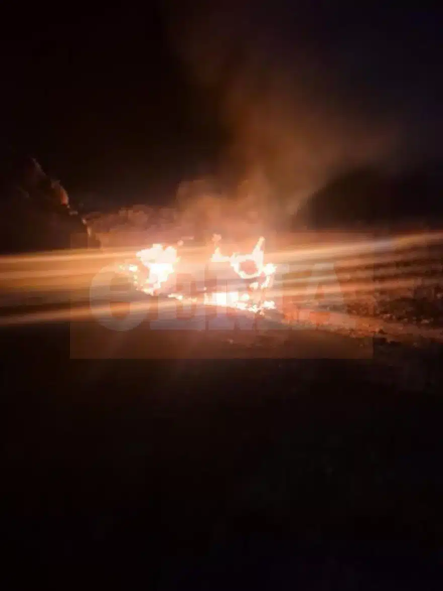 Το φλεγόμενο τζιπ με το οποίο διέφυγαν οι δράστες μετά την εν ψυχρώ δολοφονία του Γιάννη Λάλα