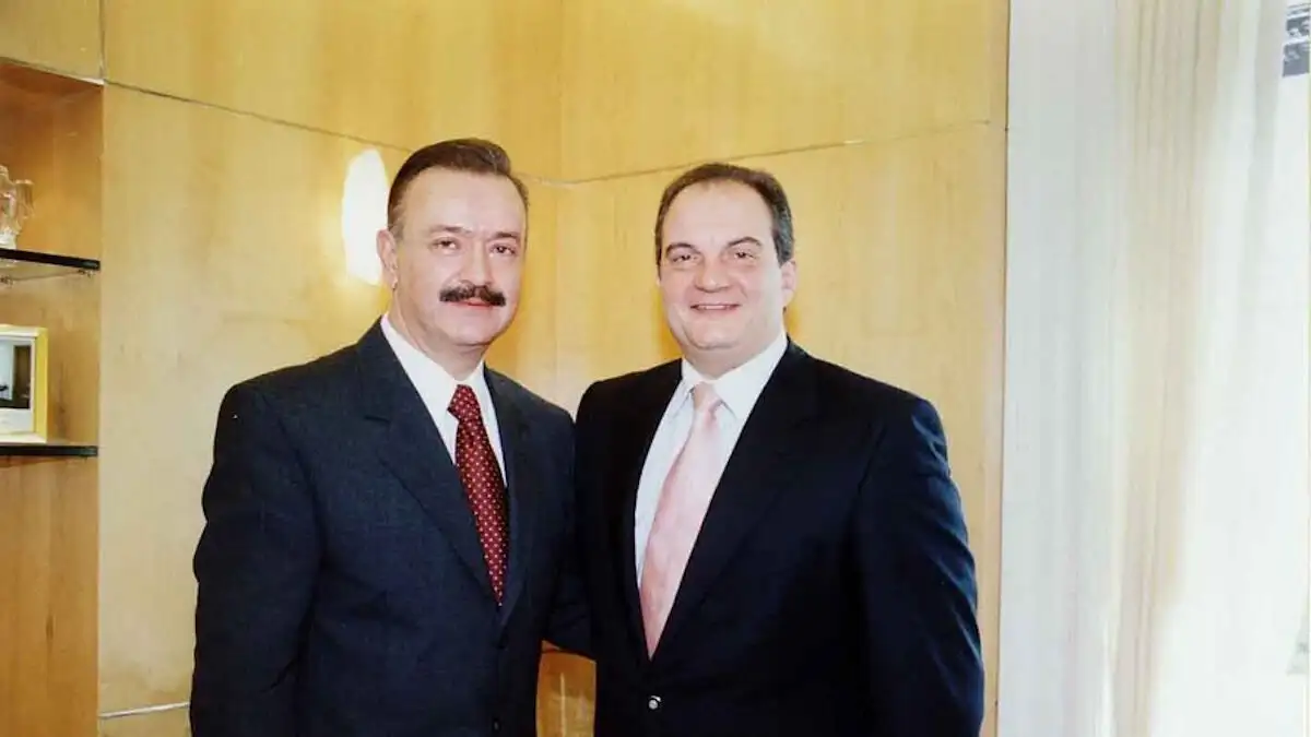 Ο Κώστας Καραμανλής με τον Δημήτρη Σταμάτη σε συνάντησή τους λίγο πριν από τις βουλευτικές εκλογές της 7ης Μαρτίου 2004