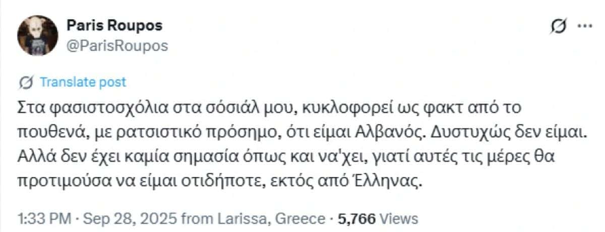 «Στα φασιστοσχόλια στα σόσιάλ μου, κυκλοφορεί ως φακτ από το πουθενά, με ρατσιστικό πρόσημο, ότι είμαι Αλβανός. Δυστυχώς δεν είμαι. Αλλά δεν έχει καμία σημασία όπως και να’χει, γιατί αυτές τις μέρες θα προτιμούσα να είμαι οτιδήποτε, εκτός από Έλληνας» έγραψε.