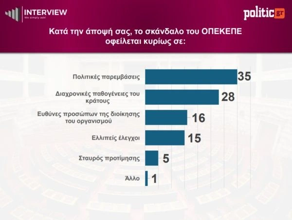 Οι πολίτες αποδίδουν την ευθύνη για το σκάνδαλο του ΟΠΕΚΕΠΕ πρωτίστως σε πολιτικές παρεμβάσεις. Συγκεκριμένα, το 35% θεωρεί ότι το ζήτημα προκύπτει από πολιτικές παρεμβάσεις, ενώ το 28% το συνδέει με διαχρονικές παθογένειες του κράτους.