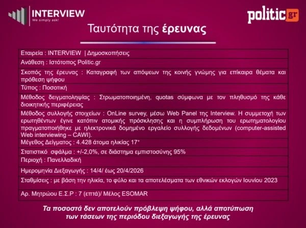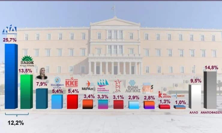 Παράλληλα, οι αναποφάσιστοι περιορίζονται στο 14,8% από 17,4% τον Μάρτιο, γεγονός που δείχνει ότι ένα μέρος του εκλογικού σώματος αρχίζει να επανατοποθετείται.