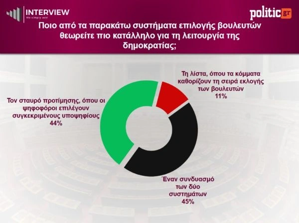 Η συζήτηση για τη μερική κατάργηση του σταυρού προτίμησης και την εισαγωγή ενός νέου εκλογικού συστήματος, προσαρμοσμένου στο λεγόμενο «γερμανικό μοντέλο», βρίσκει την κοινή γνώμη να κινείται προς μια ενδιάμεση λύση. Συγκεκριμένα, το 45% προτιμά έναν συνδυασμό σταυρού και λίστας, ενώ το 44% επιλέγει τον σταυρό προτίμησης. Αντίθετα, η καθαρή λίστα συγκεντρώνει μόλις 11%, καταγράφοντας περιορισμένη αποδοχή.