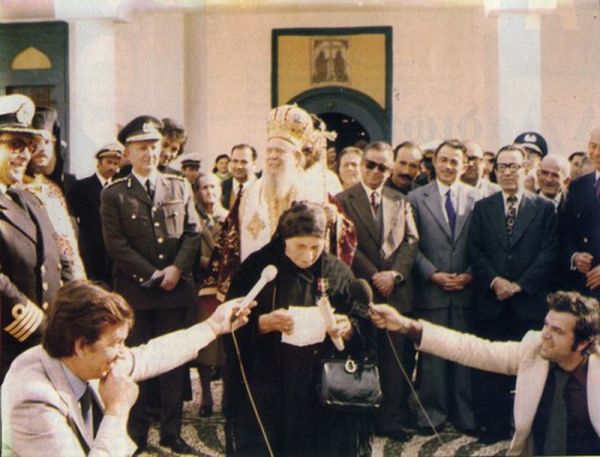 Η Κυρά της Ρω κατά την τελετή παρασημοφόρησης από το Ελληνικό Ναυτικό στο Καστελόριζο. Κάθε φορά που έβλεπε ένα καράβι να περνά έτρεχε στα βράχια και ανέβαζε τη σημαία