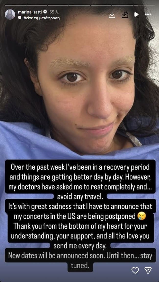 “Tην τελευταία εβδομάδα βρίσκομαι σε περίοδο ανάρρωσης και σιγά-σιγά τα πράγματα πηγαίνουν καλύτερα. Οι γιατροί, όμως, μου ζήτησαν απόλυτη ξεκούραση και καμιά μετακίνηση. Με μεγάλη μου λύπη πρέπει να ανακοινώσω ότι οι συναυλίες μου στην Αμερική αναβάλλονται. Σας ευχαριστώ από καρδιάς για την κατανόηση, την στήριξη και όλη την αγάπη μου στέλνετε καθημερινά. Οι νέες ημερομηνίες θα ανακοινωθούν σύντομα. Μέχρι τότε… stay tuned”, έγραψε στην ανάρτησή της η Μαρίνα Σάττι.