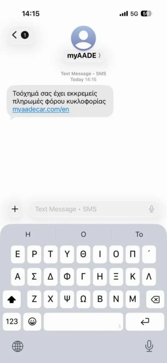Σε επιφυλακή θέτει τους πολίτες η Ανεξάρτητη Αρχή Δημοσίων Εσόδων, καθώς το τελευταίο διάστημα καταγράφεται μαζική αποστολή παραπλανητικών SMS από επιτήδειους που εμφανίζονται ως «MYaade» ή «GOV». Τα μηνύματα ενημερώνουν ψευδώς για μη καταβληθέντα τέλη κυκλοφορίας και προτρέπουν τον παραλήπτη να πατήσει σε σύνδεσμο για άμεση πληρωμή.