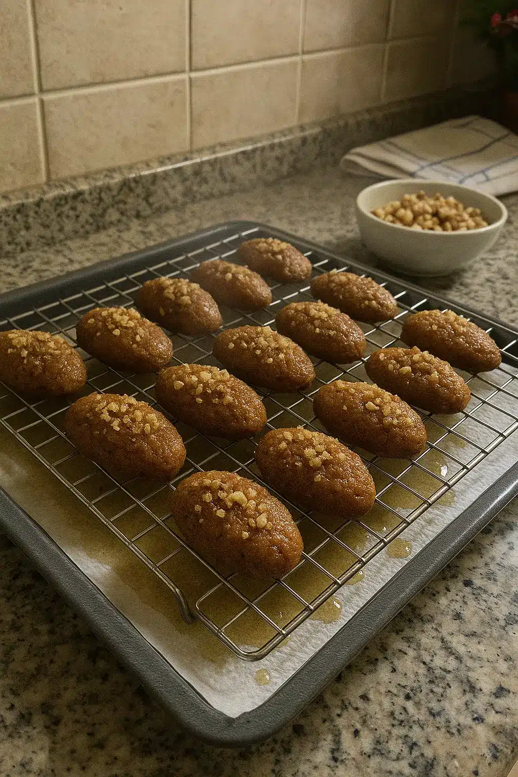 Η λύση: Το μέλι δεν βράζει. Βράζεις νερό-ζάχαρη/αρωματικά 2–3’, αποσύρεις και τότε προσθέτεις μέλι. Ψήσιμο: Αντιστάσεις 175–180°C | Αέρας 160–170°C, 20–25’ μέχρι βαθύ χρυσαφί (όχι καφέ).