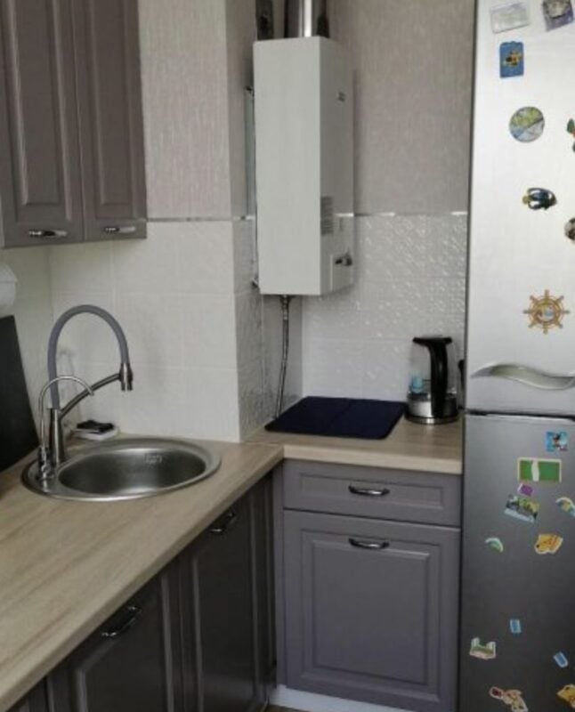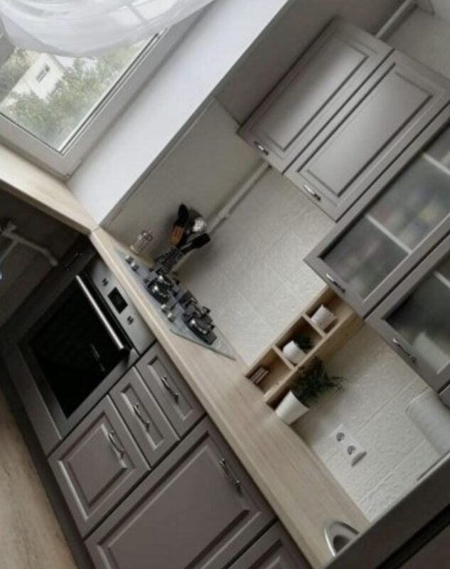 Ο χώρος είναι 4,5 m², το οποίο είναι πολύ μικρός. Παρ’ όλα αυτά, καταφέραμε να τοποθετήσουμε όχι μόνο μια εστία, αλλά και ένα πλυντήριο πιάτων και ένα ψυγείο. Η διάταξη αυτών των συσκευών είχε σχεδιαστεί πολύ καλά.