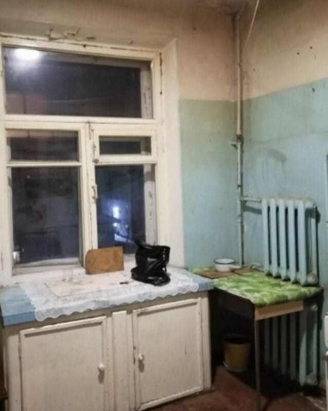 Αυτή τη φωτογραφία τη βγάλαμε όταν ο τοίχος ήταν ακόμα συνδεδεμένος με το μπάνιο. Η κουζίνα ήταν σε φρικτή κατάσταση: ένας άχρηστος νιπτήρας, μεταλλικά ράφια για τα πιάτα και πλακάκια σοβιετικού τύπου. Ήταν προφανές ότι οι ανακαινίσεις είχαν γίνει στην εποχή της Σοβιετικής Ένωσης.