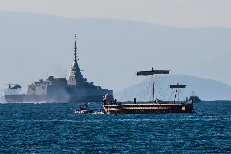 Με φόντο τον Ναύσταθμο Σαλαμίνας και τη βαριά ιστορική μνήμη του ελληνικού στόλου, η άφιξη του «Κίμωνα», της πρώτης ελληνικής φρεγάτας τύπου Belharra, εξελίχθηκε σε μια επιβλητική τελετή με έντονο συμβολισμό και σαφές στρατηγικό μήνυμα.