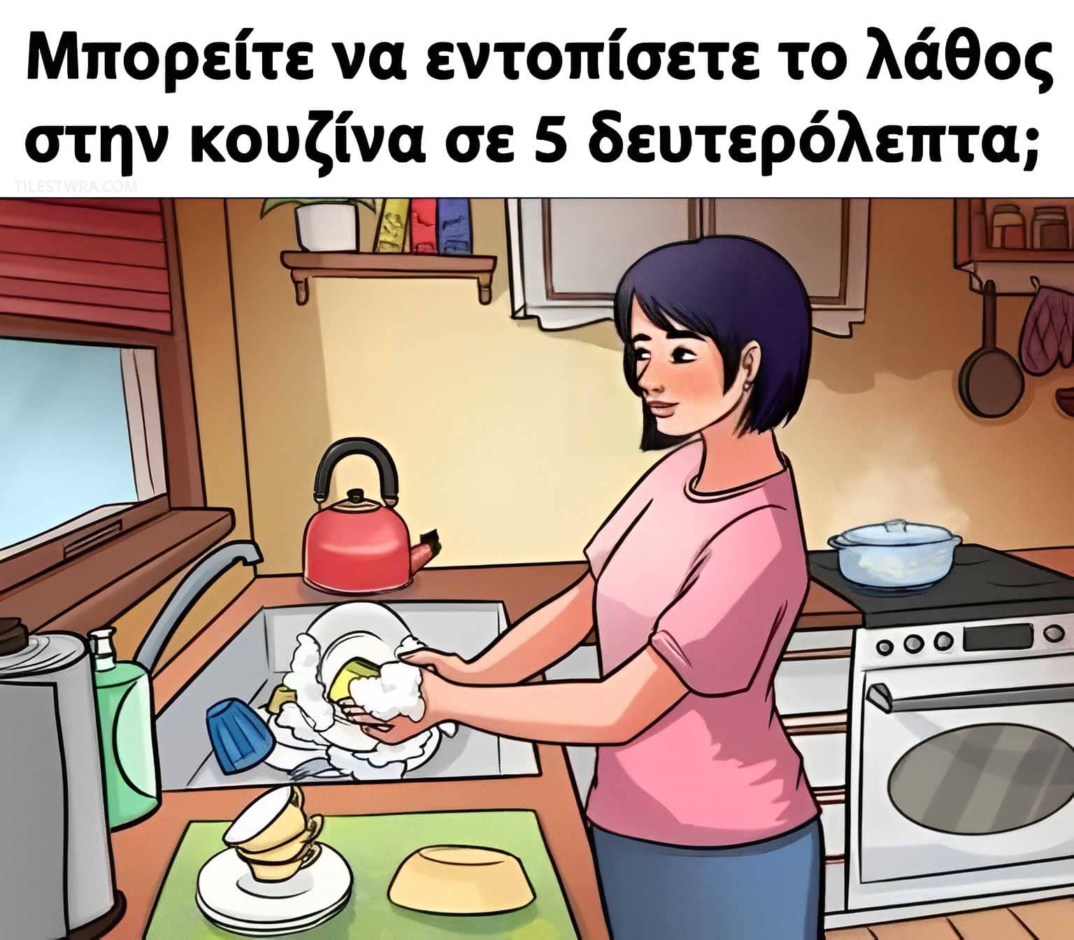 Σε αυτό το παζλ, θα εμφανιστεί μια εικόνα κουζίνας και το καθήκον σας είναι να εντοπίσετε το λάθος μέσα σε μόλις 5 δευτερόλεπτα. Ακούγεται εύκολο; Ξανασκέψου! Αυτή η πρόκληση απαιτεί ακρίβεια, έντονη παρατήρηση και κοφτερό μυαλό.