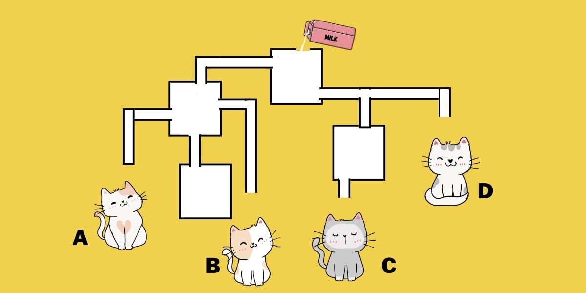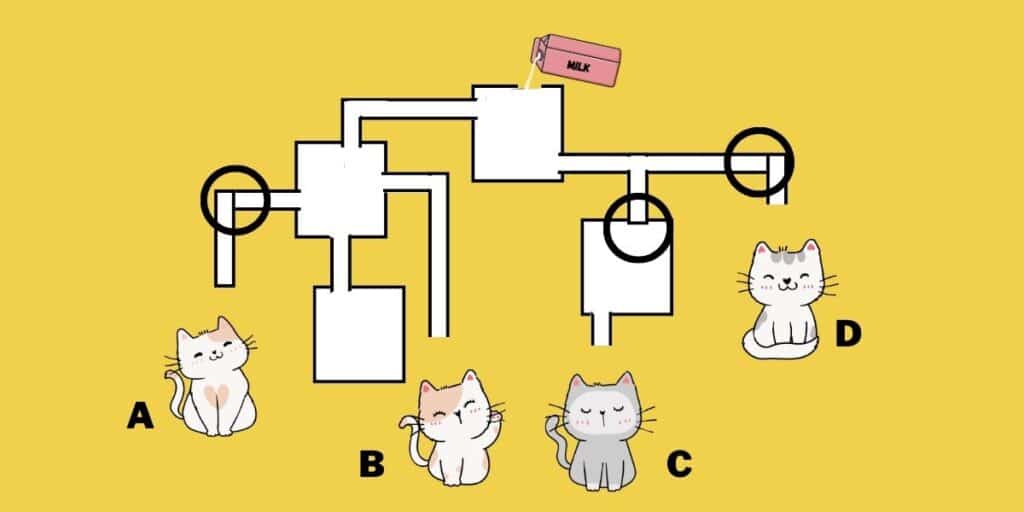 Η παρακάτω εικόνα δείχνει έναν λαβύρινθο από σωλήνες και δεξαμενές και σας ζητείται να υπολογίσετε ποια γάτα θα πιει πρώτη γάλα. Ωστόσο δεν έχετε πολύ χρόνο. Πρέπει να βρείτε την απάντηση σε μόλις 19 δευτερόλεπτα.