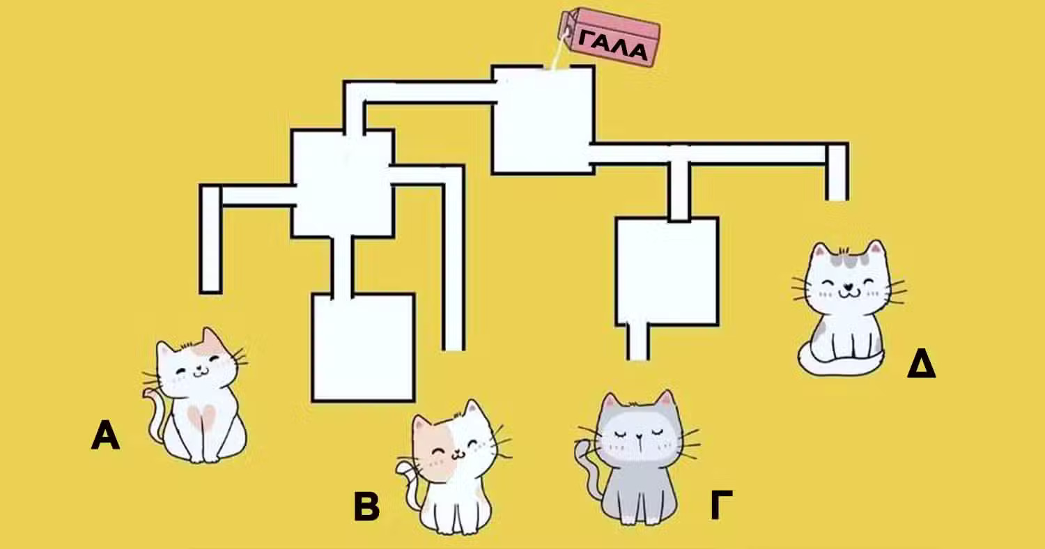 Η παρακάτω εικόνα δείχνει έναν λαβύρινθο από σωλήνες και δεξαμενές και σας ζητείται να υπολογίσετε ποια γάτα θα πιει πρώτη γάλα. Ωστόσο δεν έχετε πολύ χρόνο. Πρέπει να βρείτε την απάντηση σε μόλις 19 δευτερόλεπτα.
