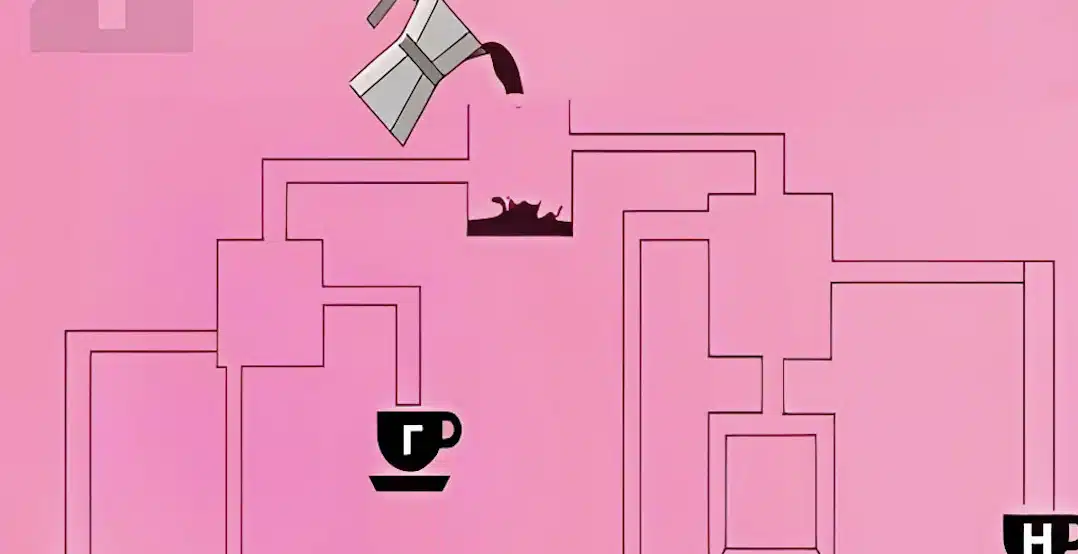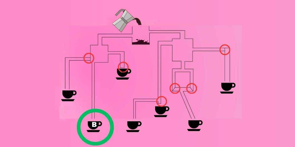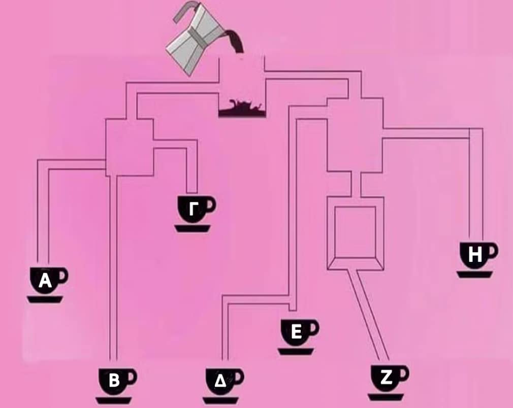 Η παρακάτω εικόνα δείχνει έναν περίπλοκο λαβύρινθο από σωλήνες και δεξαμενές και σας ζητείται να υπολογίσετε ποιο φλιτζάνι θα γεμίσει πρώτο με καφέ. Ωστόσο δεν έχει πολύ χρόνο. Πρέπει να βρείτε την απάντηση σε μόλις 15 δευτερόλεπτα.