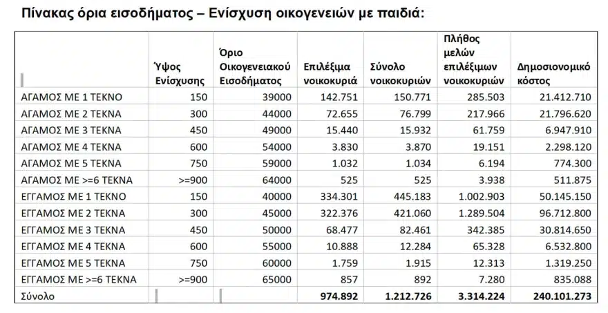 Επιπλέον, προβλέπεται έκτακτη οικονομική ενίσχυση 150 ευρώ ανά παιδί στα τέλη Ιουνίου, με συνολικό κόστος 240 εκατ. ευρώ και περίπου 975.000 νοικοκυριά δικαιούχους.