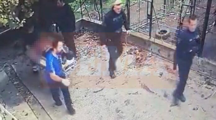 Σε βίντεο που δημοσιεύει το protothema.gr διακρίνονται αστυνομικοί που φτάνουν στην αυλή αλλά και άνδρες του ΕΚΑΒ που παραλαμβάνουν τον ηλικιωμένο με φορείο:
