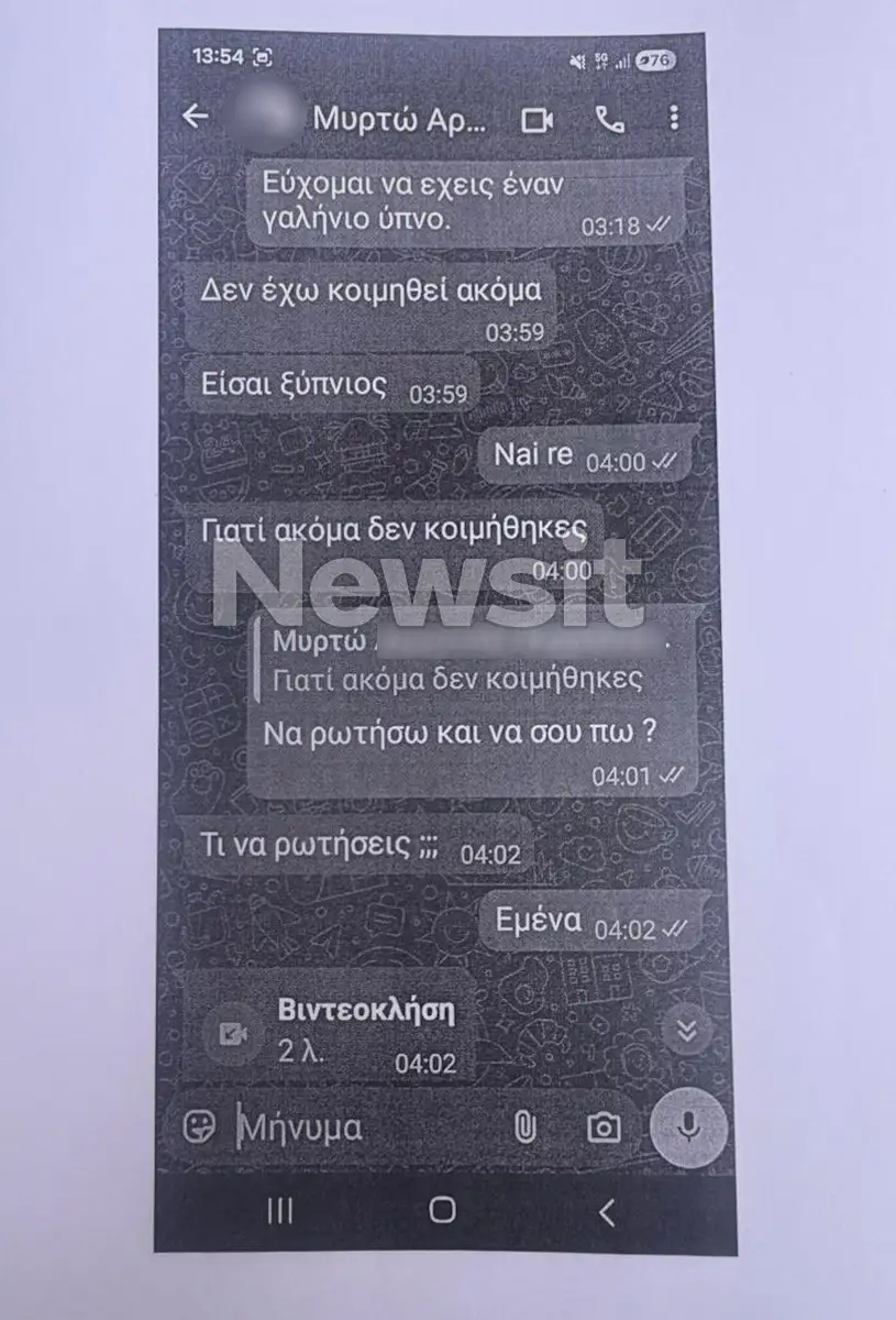 Όπως αποδεικνύεται από τα μηνύματα, η κοπέλα φαίνεται να ήταν ζωντανή έως τις 4 το πρωί της Τρίτης. Και αυτό γιατί στις 04:02 τα ξημερώματα της, η Μυρτώ επικοινώνησε με τον φίλο της μέσω βιντεοκλήσης.
