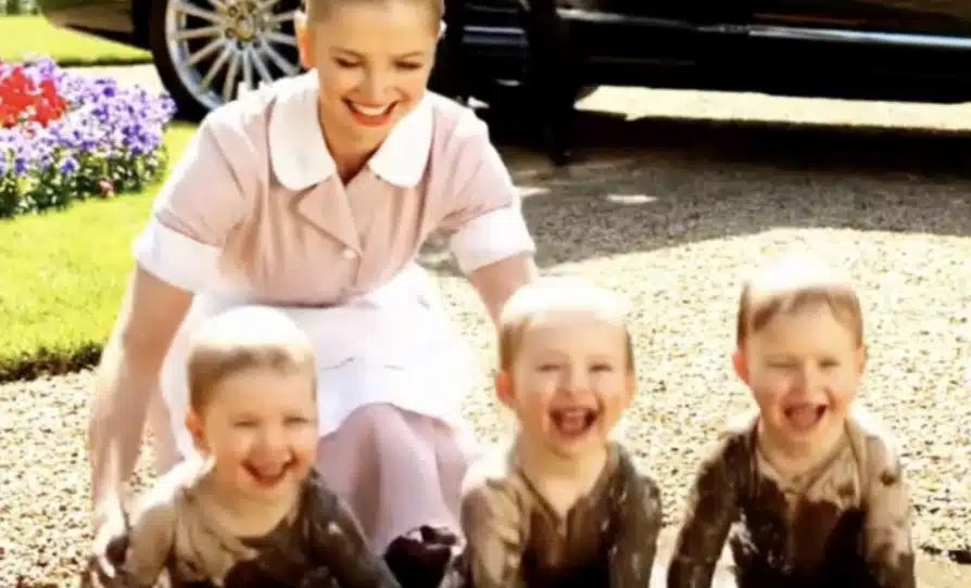Λίγο πιο δίπλα, γονατισμένη κοντά τους, η νταντά — με μπεζ ροζ στολή και λευκή ποδιά — χαμογελούσε σαν να παρακολουθούσε κάτι ιερό.