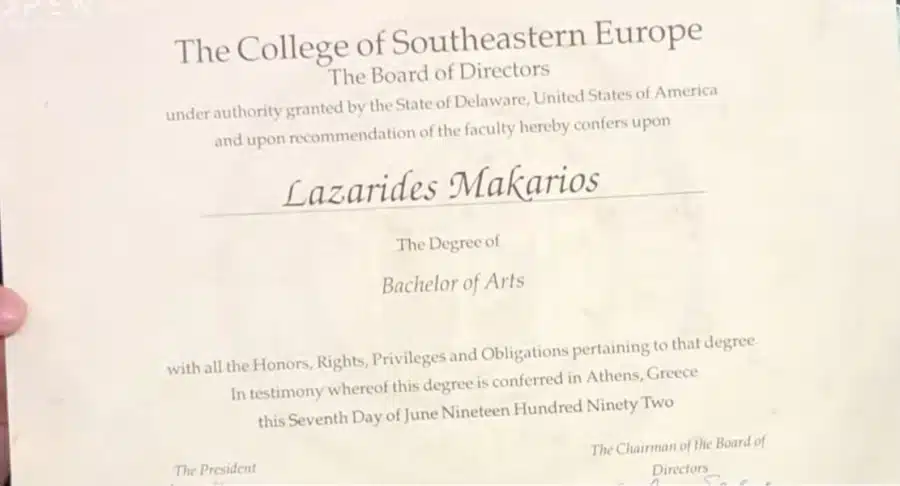 «Το 1987 έκανα μία συνειδητή επιλογή, σε ηλικία 18 ετών, να σπουδάσω σε ένα κολέγιο, στο College of the Southern Eastern Europe, ένα από τα δύο μεγαλύτερα κολέγια τότε στην Ελλάδα. Αποφοίτησα το 1992, αυτό είναι το πτυχίο μου», δήλωσε χαρακτηριστικά.