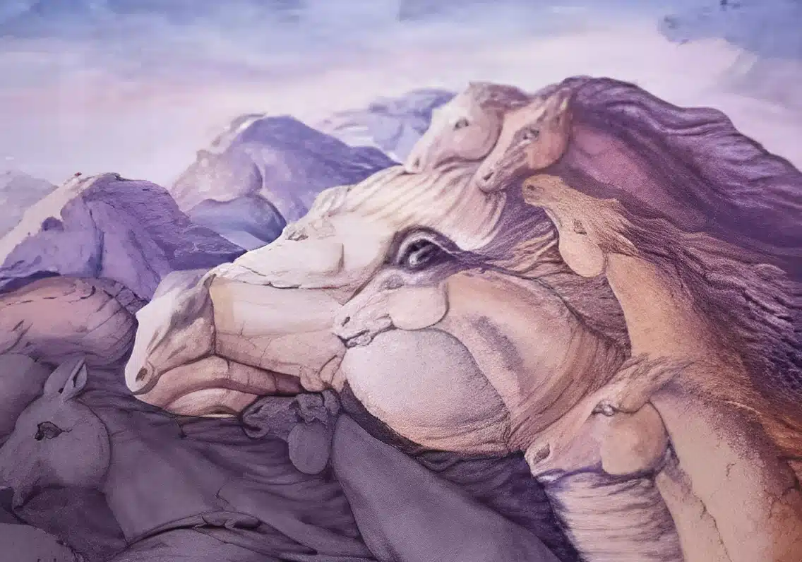 Αρχικά, κάποιος βλέπει ένα μεγάλο άλογο, αλλά με πιο προσεκτική παρατήρηση διαπιστώνει ότι η μορφή αποτελείται από πολλά μικρότερα άλογα και άλλα ζώα που είναι ενσωματωμένα στο σχέδιο.