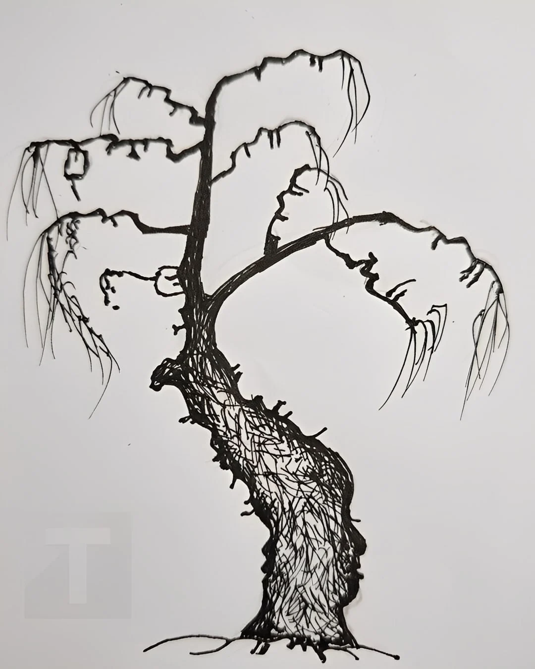 Η κόμη του δέντρου σχηματίζεται από τα προφίλ ανθρώπινων προσώπων — κάθε πρόσωπο ξεχωριστό, κάθε ένα να παρακολουθεί σιωπηλά. Κάποια δείχνουν γαλήνια, άλλα προβληματισμένα, και μερικά μοιάζουν χαμένα στις σκέψεις τους. Είναι σαν το δέντρο να αποτελείται από ιστορίες, μνήμες ή απόηχους του παρελθόντος.