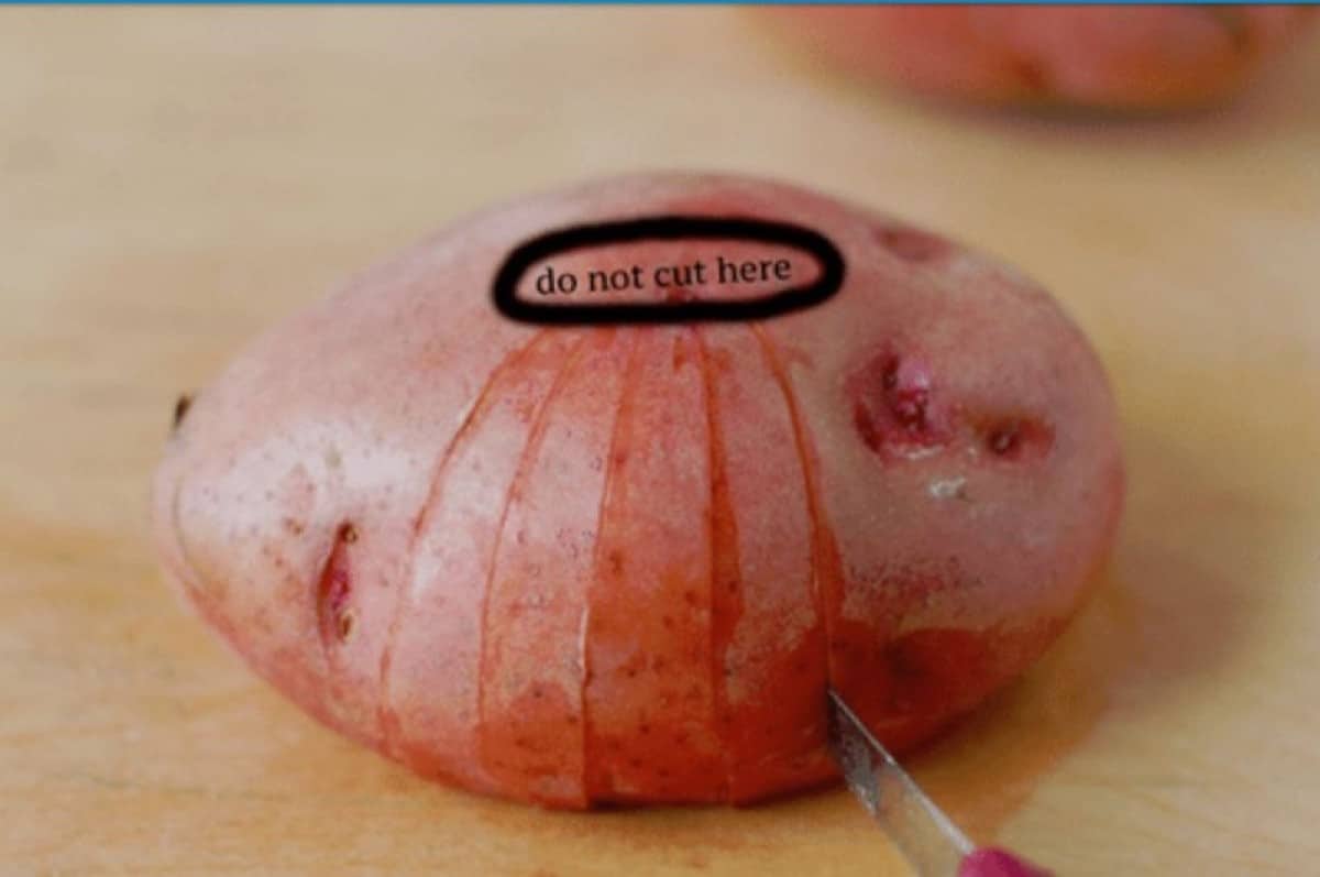 Αναποδογυρίστε την πατάτα και χαράξτε την περιμετρικά. Προσέξτε μόνο να αφήσετε ένα μικρό κομμάτι άκοπο στην κορυφή. Αυτές οι χαρακιές πρέπει να φτάνουν μέχρι το κέντρο της πατάτας.
