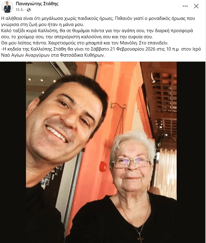 «Η αλήθεια είναι ότι μεγάλωσα χωρίς παιδικούς ήρωες. Πιθανόν γιατί ο μοναδικός ήρωας που γνώρισα στη ζωή μου ήταν η μάνα μου. Καλό ταξίδι κυρά Καλλιόπη, θα σε θυμάμαι πάντα για την αγάπη σου, την διαρκή προσφορά σου, το χιούμορ σου, την απεριόριστη καλοσύνη σου και την ευφυία σου. Θα μου λείπεις πάντα. Χαιρετισμούς στο μπαμπά και τον Μανόλη. Στο επανιδείν. Η κηδεία της Καλλιόπης Στάθη θα γίνει το Σάββατο 21 Φεβρουαρίου 2026 στις 10 π.μ στον Ιερό Ναό Αγίων Αναργύρων στα Φατσάδικα Κυθήρων» έγραψε ο Παναγιώτης Στάθης.