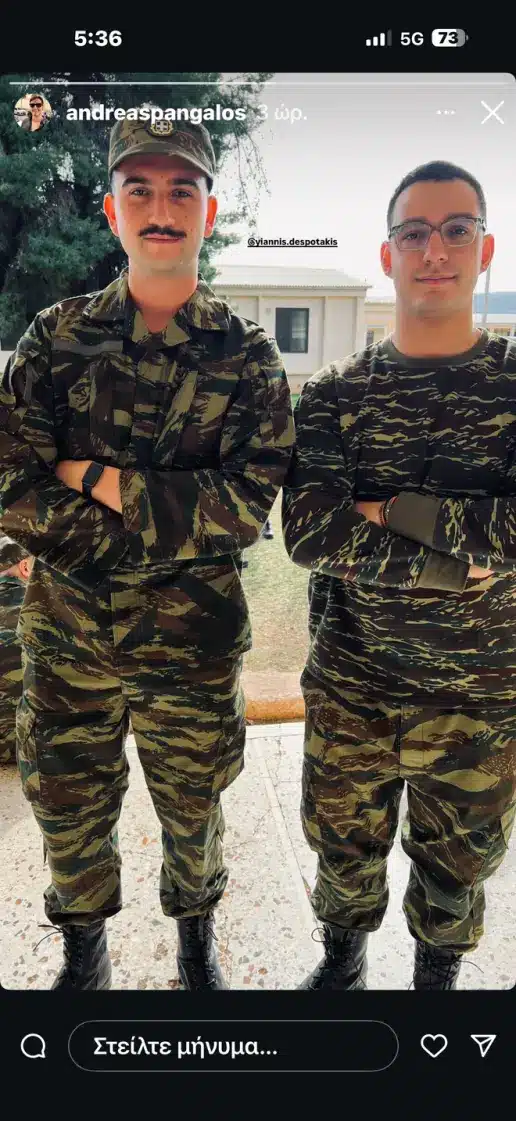 Παρουσιάστηκε στον στρατό ο γιος του Θεόδωρου Πάγκαλου. Ο Ανδρέας Πάγκαλος μπήκε χθες, Τρίτη (11/11), στον Αυλώνα για τη βασική εκπαίδευση της θητείας του, στον Στρατό Ξηράς. Ο 25χρονος γνωστοποίησε την έναρξη της στρατιωτικής του θητείας μέσω ανάρτησης στα κοινωνικά δίκτυα, με τον ίδιο να φωτογραφίζεται πλάι σε ακόμα έναν φαντάρο, φορώντας παραλλαγή.