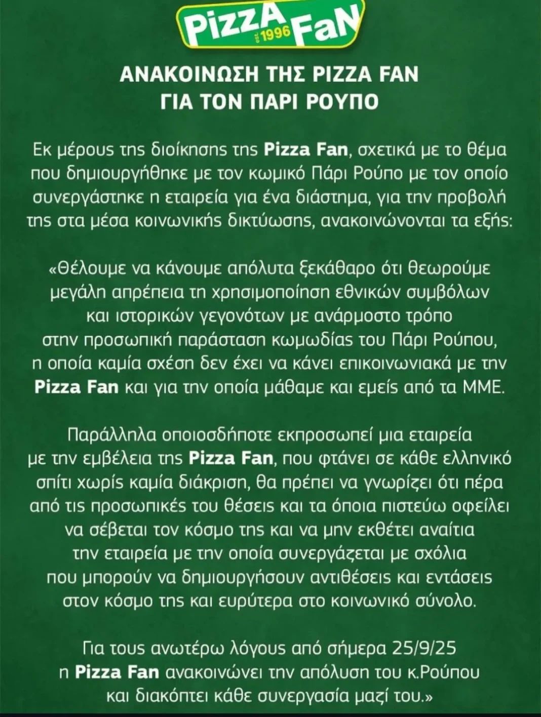 «Εκ μέρους της διοίκησης της Pizza Fan, σχετικά με το θέμα που δημιουργήθηκε με τον κωμικό Πάρι Ρούπο με τον οποίο συνεργάστηκε η εταιρεία για ένα διάστημα, για την προβολή της στα μέσα κοινωνικής δικτύωσης, ανακοινώνονται τα εξής: