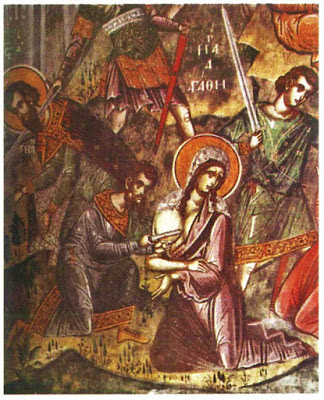 Μόλις πλησίασαν τὰ μεσάνυκτα, ἐπισκέφθηκαν τὴν Ἁγία ὁ Ἀπόστολος Πέτρος, μὲ μορφὴ γέροντα καὶ ἕνας Ἄγγελος, μὲ μορφὴ παιδιοῦ, ποὺ κρατοῦσε λαμπάδα. Ἄπλετο φῶς πλημμύρισε τὸ ὑγρὸ καὶ σκοτεινὸ κελὶ τῆς Ἁγίας.