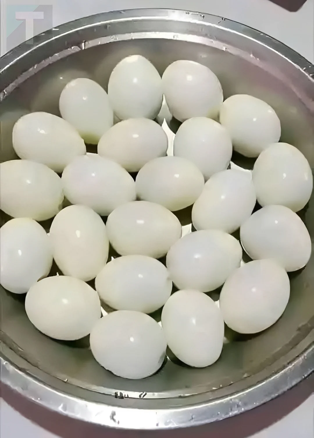 Τα αυγά είναι τοποθετημένα κυκλικά μέσα στη λεκάνη, δημιουργώντας μια αίσθηση τάξης και πληρότητας. Το λευκό τους χρώμα είναι καθαρό και γυαλιστερό, ένδειξη ότι έχουν βραστεί και καθαριστεί προσεκτικά. Η μεταλλική επιφάνεια του σκεύους αντανακλά ελαφρώς το φως, δίνοντας έμφαση στη φρεσκάδα και την απλότητα του τροφίμου.