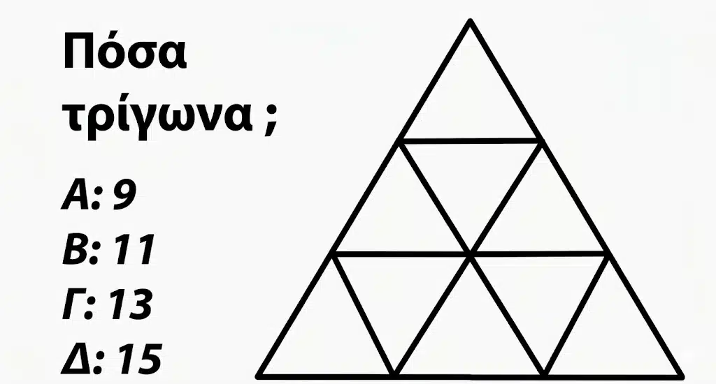 Μην ξεχνάς τα «κρυφά» — κάποια τρίγωνα μοιράζονται πλευρές ή κρύβονται μέσα στις γραμμές.