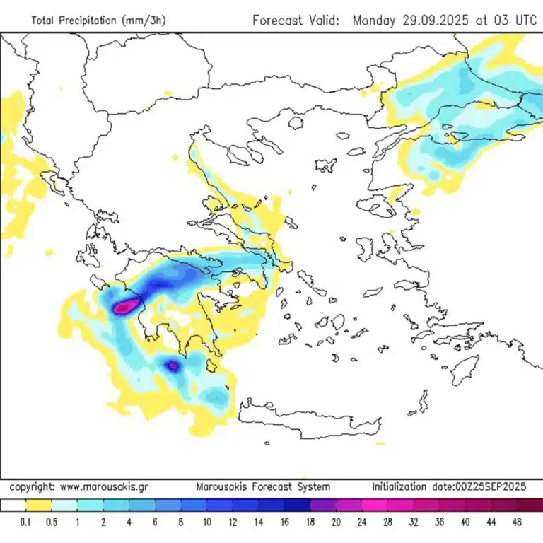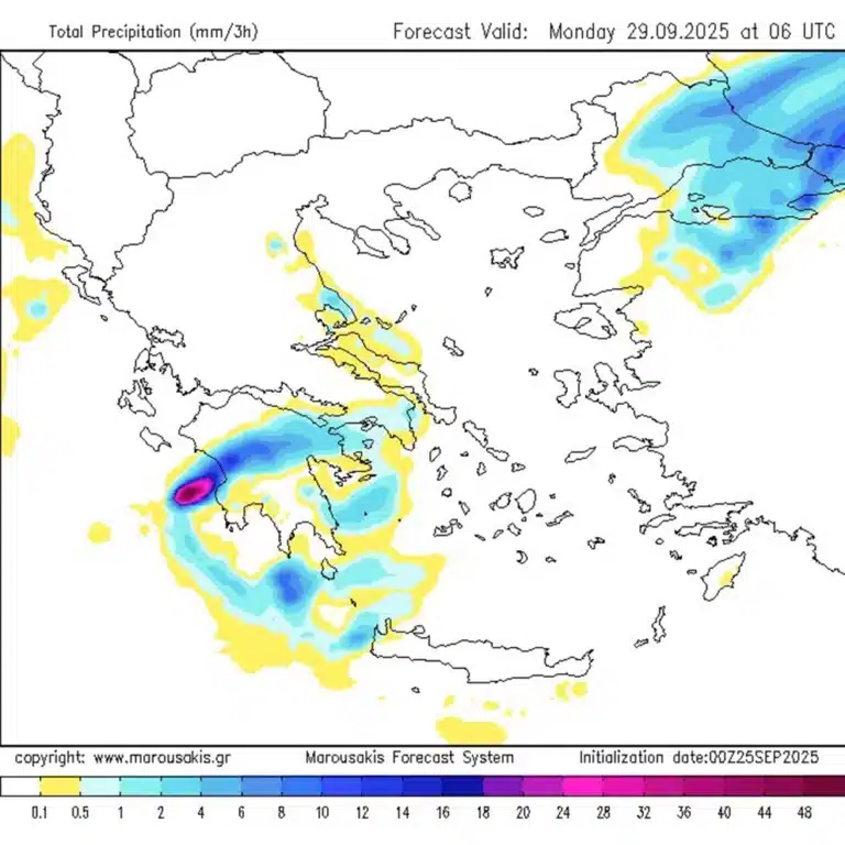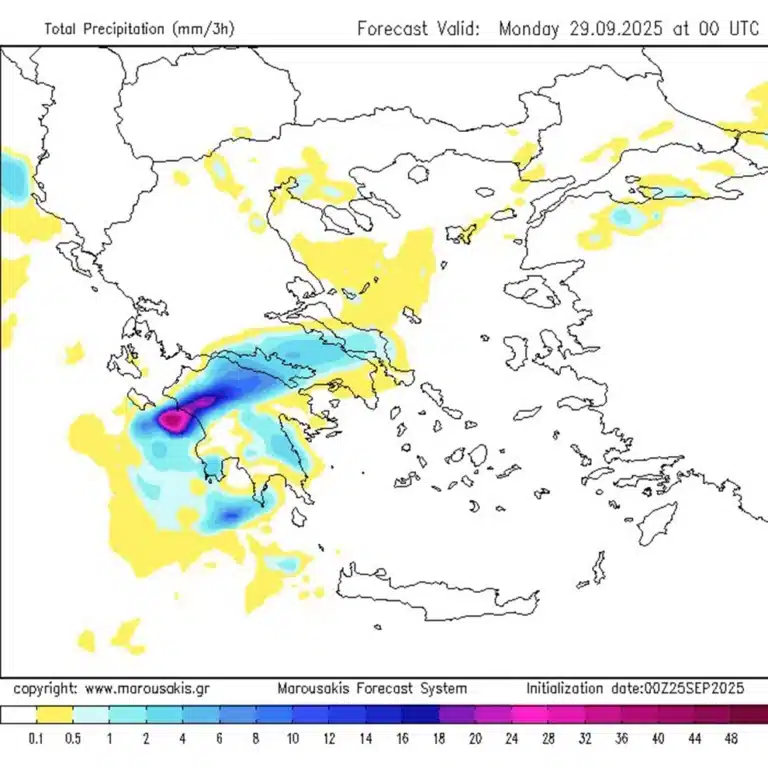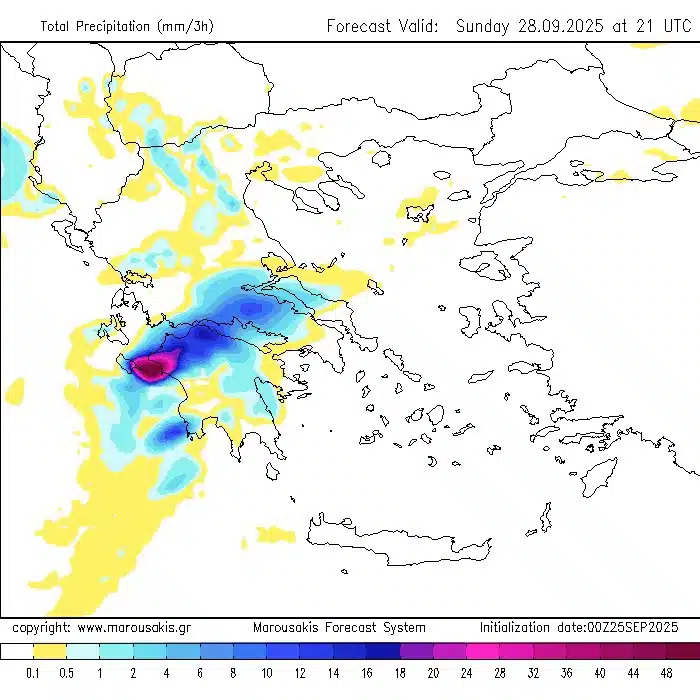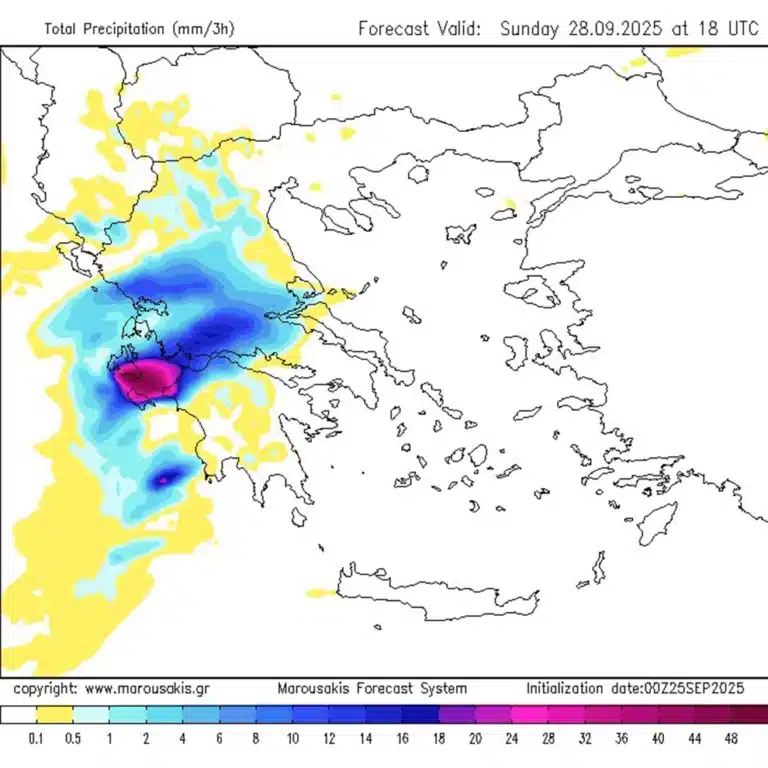 Την Κυριακή, σύμφωνα με τον κ. Μαρουσάκη, χρειάζεται «μεγάλη προσοχή προς το κεντρικό και νότιο Ιόνιο, προς τη δυτική Στερεά, τη δυτική και νότια Πελοπόννησο, όπου περιμένουμε μεγάλο όγκο νερού. Ακραία φθινοπωρινός καιρός… δεν αποκλείεται να αντιμετωπίσουμε και προβλήματα, πλημμυρικά επεισόδια σε εκείνες τις περιοχές».