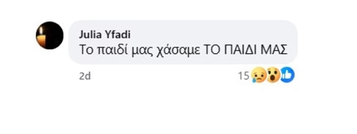 «R. I. P. αγόρι μου», έγραψε, συνοδεύοντας τα λόγια της με φωτογραφία του γιου της. Φίλοι και συγγενείς έσπευσαν να εκφράσουν τα συλλυπητήριά τους, με τη μητέρα να απαντά σε μήνυμα γνωστού της: «Το παιδί μας χάθηκε…», αποτυπώνοντας τον ανείπωτο πόνο της οικογένειας.