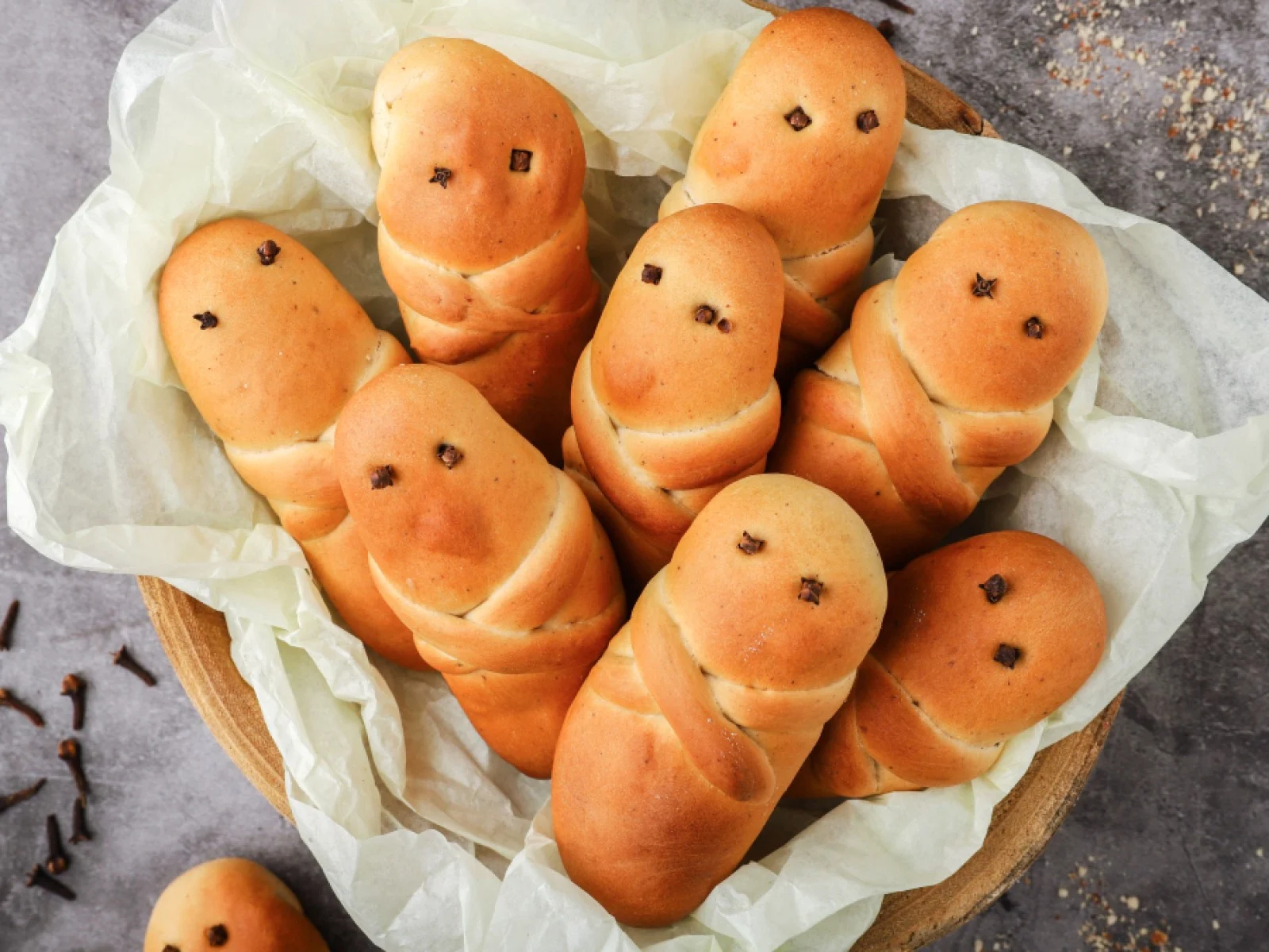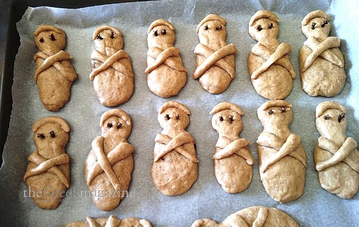 Ρίχνουμε το αλεύρι και ζυμώνουμε σε μέτρια ζύμη. Αδειάζουμε το ζυμάρι στον αλευρωμένο πάγκο της κουζίνας και ξαναζυμώνουμε με δύναμη. Χωρίζουμε το ζυμάρι σε κομμάτια τα οποία τα πλάθουμε σε ανθρωπάκια τοποθετώντας τα μοσχοκάρφια για μάτια, μύτη κτλ.