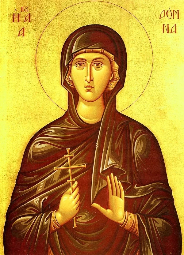 Η Αγία Δόμνα ήταν Ιέρεια των ειδώλων επί Μαξιμιανού στη Νικομήδεια και συγκεκριμένα στο ναό του Δωδεκάθεου. Οι επιστολές του Αποστόλου Παύλου, άνοιξαν τα πνευματικά της μάτια και βαπτίστηκε χριστιανή, μαζί με τον υπηρέτη της Ινδή, από τον επίσκοπο Νικομήδειας Κύριλλο.