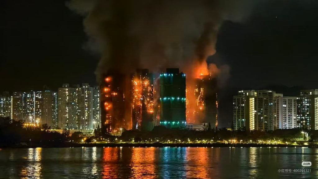 Οι φλόγες συνεχίζουν να καίνε τις σκαλωσιές από μπαμπού στα κτίρια, αναφέρουν τοπικά μέσα ενημέρωσης. Οι φλόγες τύλιξαν και τα οκτώ κτίρια του συγκροτήματος Wang Fuk Court, με πολλούς κατοίκους να έχουν παγιδευτεί μέσα στα διαμερίσματα.