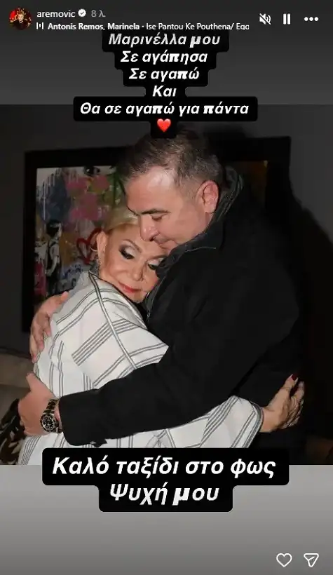 Με μια φωτογραφία που είναι αγκαλιά, ο Αντώνης Ρέμος αποχαιρετά την πολύ καλή του φίλη Μαρινέλλα που πέθανε σήμερα (28/03/2026) σε ηλικία 88 ετών.