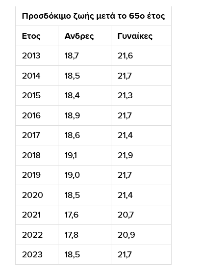 - Γυναίκες 65+: από 21,6 σε 21,7 έτη.