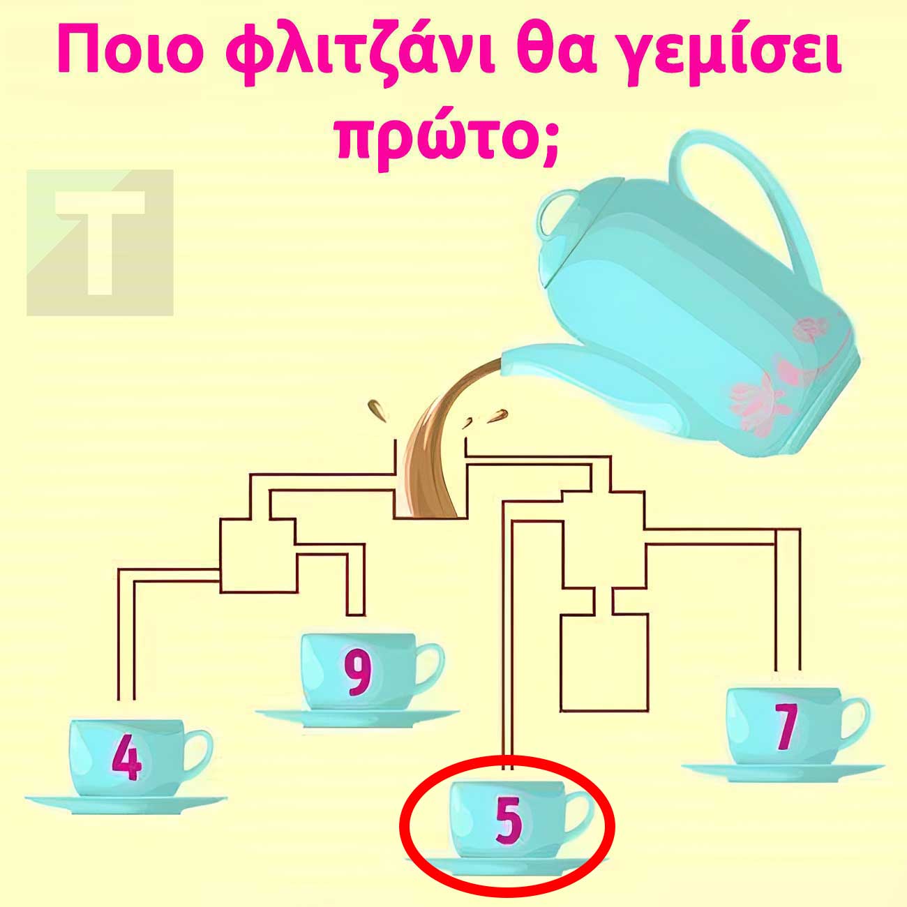Παρατηρώντας με προσοχή όλες τις δεξαμενές και δημιουργώντας στο μυαλό σας την διαδρομή που θα ακολουθήσει το τσάι θα καταλήξετε ότι το φλιτζάνι που θα γεμίσει πρώτο είναι αυτό με το νούμερο 5.