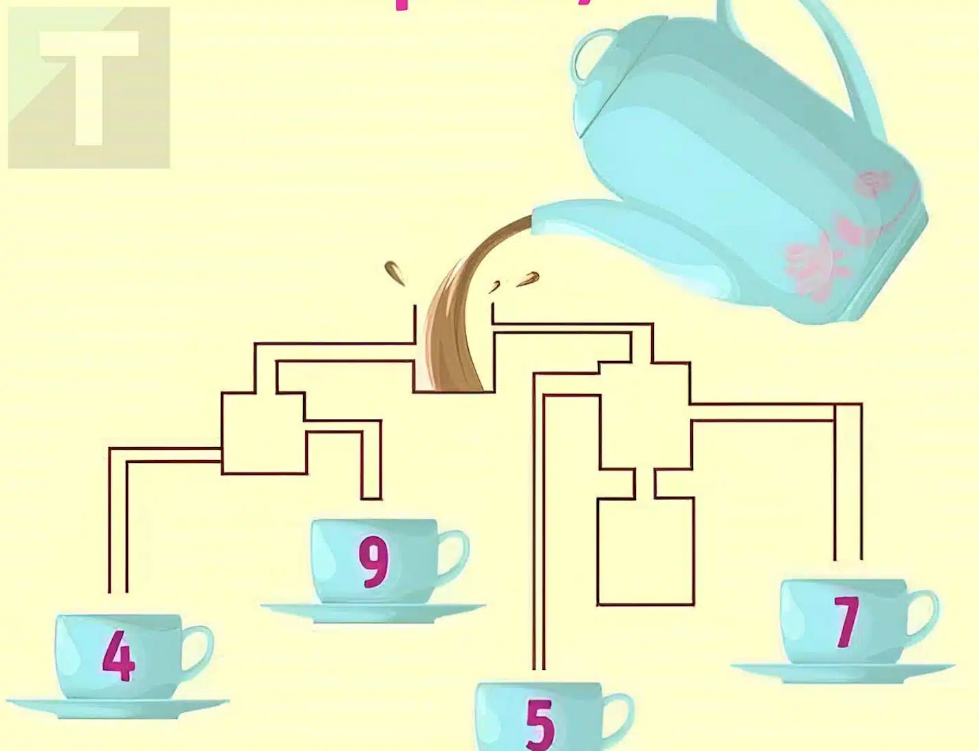 Η παρακάτω εικόνα δείχνει έναν λαβύρινθο από σωλήνες και δεξαμενές νερού και σας ζητείται να υπολογίσετε ποιο φλιτζάνι θα γεμίσει πρώτο με τσάι . Ωστόσο δεν έχετε πολύ χρόνο. Πρέπει να βρείτε την απάντηση σε μόλις 5 δευτερόλεπτα.