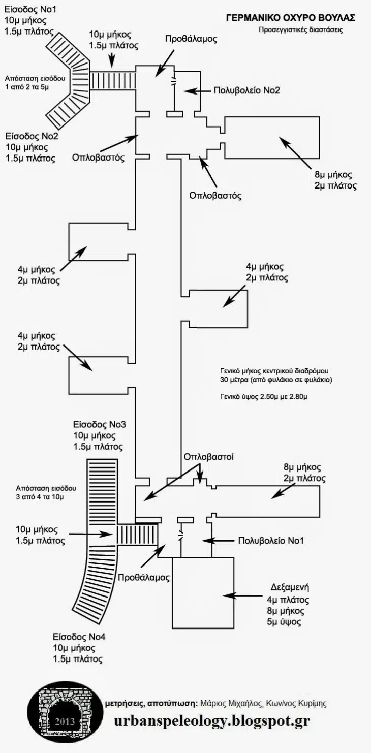 Είναι ένα αρκετά μεγάλο σύμπλεγμα υπόγειων διαδρόμων, που αποτελείται από δύο παράλληλες βασικές στοές και άλλες μικρότερες που τις συνδέουν μεταξύ τους, κάθετα προς αυτές, ενώ υπάρχουν και άλλες που είναι τυφλές (καταλήγουν σε βράχο). Υπάρχουν εσωτερικές μεταλλικές πόρτες και μερικά σημεία διαμορφωμένα και χτισμένα με σύγχρονα τούβλα.