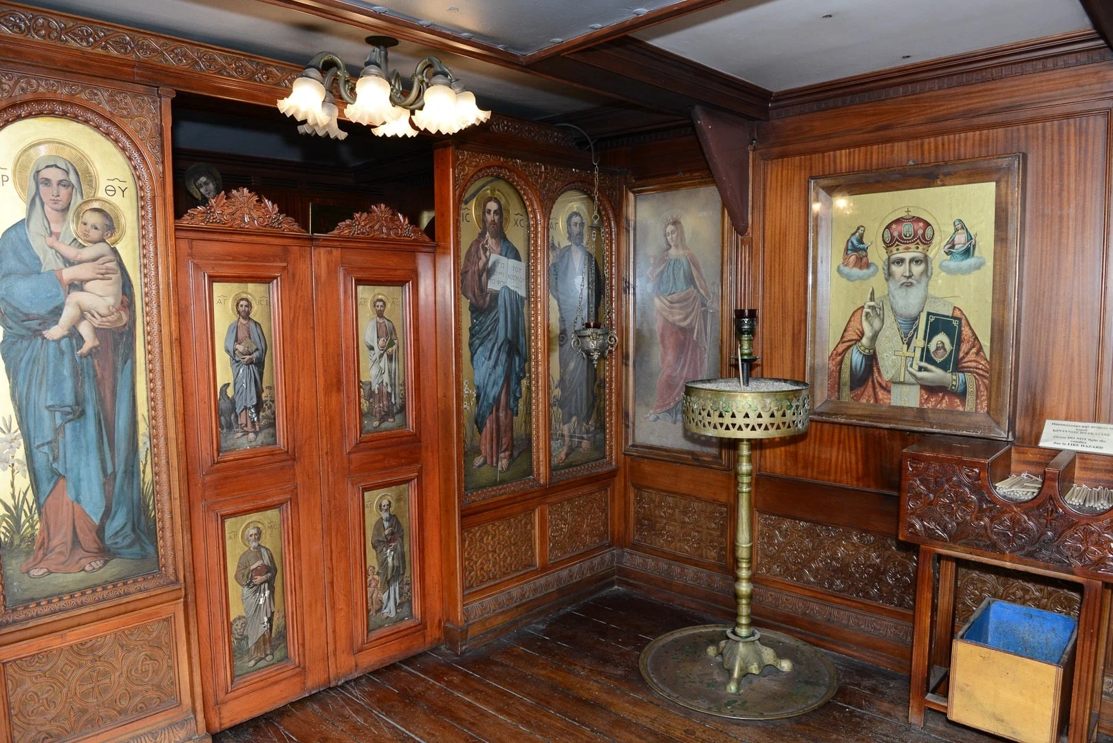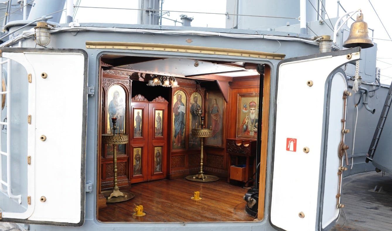 Το εκκλησάκι τοποθετήθηκε στο σημείο που ήταν σχεδιασμένη η πυριταποθήκη. Πρόκειται για το μοναδικό πολεμικό πλοίο με ναό και μάλιστα πάντοτε υπηρετούσε ιερέας, που ήταν ο τρίτος στην αρχαιότητα σε βαθμό.