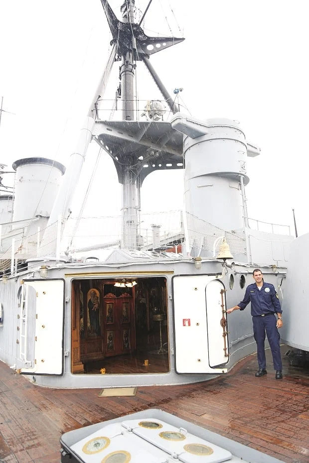 «Τα χριστιανικά αισθήματα της τότε ελληνικής κοινωνίας αλλά και οι προσωπικές πεποιθήσεις των αξιωματικών του Πολεμικού Ναυτικού και όχι μόνο του Π. Κουντουριώτη φρόντισαν ώστε στο νέο εύδρομο του στόλου, το θωρηκτό «Γ. Αβέρωφ», να υπάρχει εκκλησία επί του καταστρώματος, παρότι δεν προβλεπόταν από τα αρχικά σχέδια του πλοίου, τα οποία προσαρμόστηκαν κατόπιν σχετικής επιθυμίας και παραγγελίας του Πολεμικού Ναυτικού» εξηγεί ο αρχιμανδρίτης Ιουστίνος Μαρμαρινός, συνταγματάρχης (ΣΙ) ιερέας ΓΕΝ.