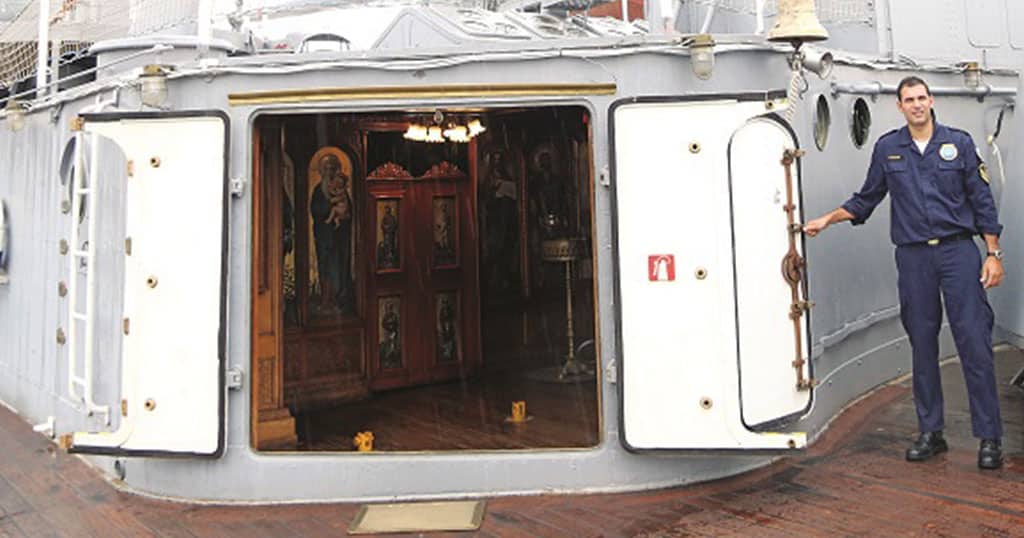 «Τα χριστιανικά αισθήματα της τότε ελληνικής κοινωνίας αλλά και οι προσωπικές πεποιθήσεις των αξιωματικών του Πολεμικού Ναυτικού και όχι μόνο του Π. Κουντουριώτη φρόντισαν ώστε στο νέο εύδρομο του στόλου, το θωρηκτό «Γ. Αβέρωφ», να υπάρχει εκκλησία επί του καταστρώματος, παρότι δεν προβλεπόταν από τα αρχικά σχέδια του πλοίου, τα οποία προσαρμόστηκαν κατόπιν σχετικής επιθυμίας και παραγγελίας του Πολεμικού Ναυτικού» εξηγεί ο αρχιμανδρίτης Ιουστίνος Μαρμαρινός, συνταγματάρχης (ΣΙ) ιερέας ΓΕΝ.